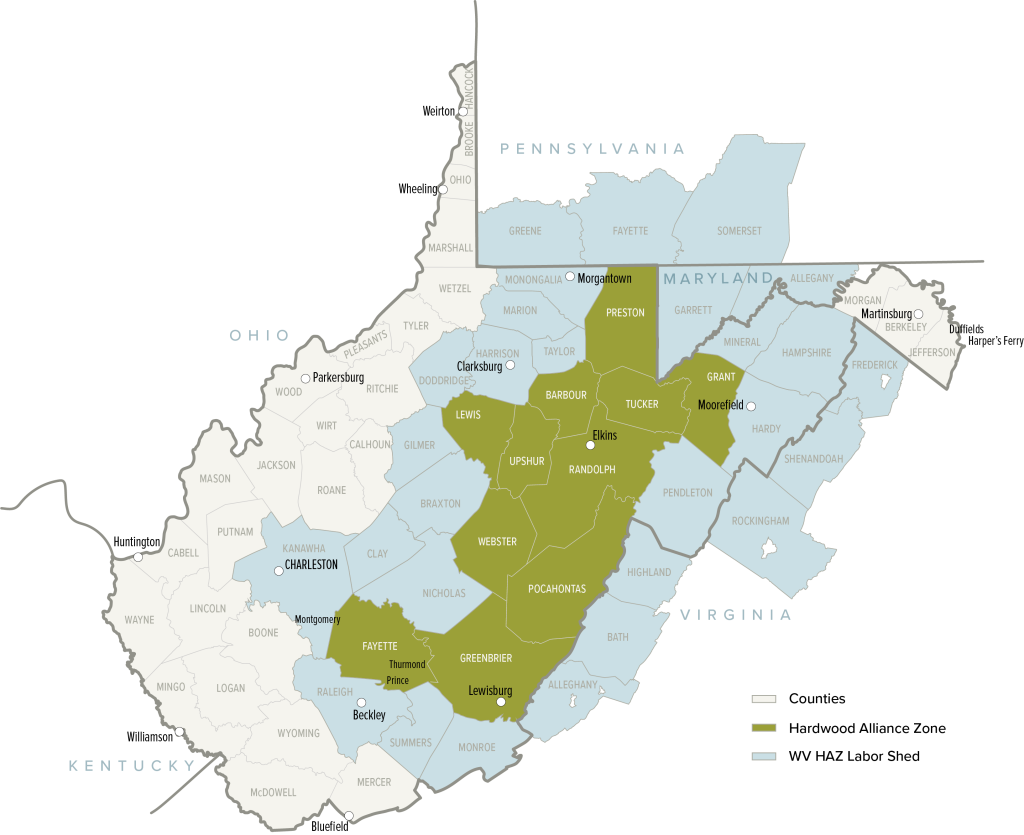 The WVHAZ covers a 12-county region in central and eastern West Virginia—an area rich in hardwood resources and workforce talent. The region sit within a 500-mile radius of over 50% of the U.S. population and 30% of Canada’s, giving manufacturers and distributors a significant logistical advantage.